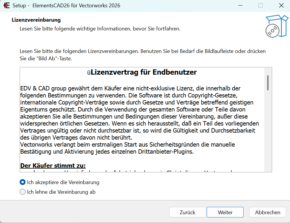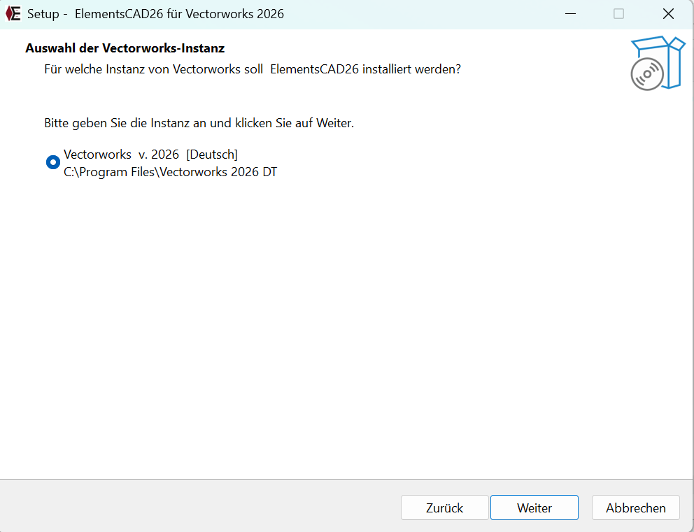(z. B. Vectorworks 2026 Architektur oder Vectorworks 2026 Basic).Die Installationsdatei ElementsCAD für Vectorworks liegt vor.