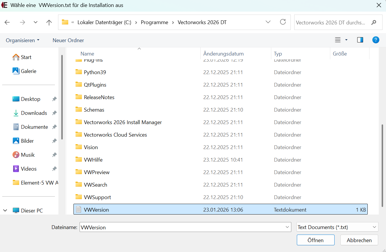 Wird Vectorworks nicht automatisch erkannt, kann die VWVersion.txt manuell ausgewählt werden.
