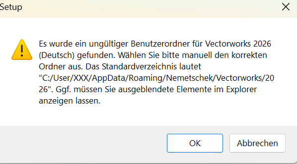 „Es wurde ein ungültiger Benutzerordner für Vectorworks 2026 (Deutsch) gefunden.“