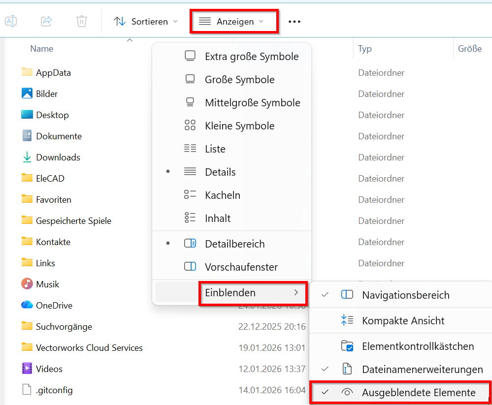 Damit der korrekte Benutzerordner ausgewählt werden kann, müssen zunächst ausgeblendete Elemente sichtbar gemacht werden.
