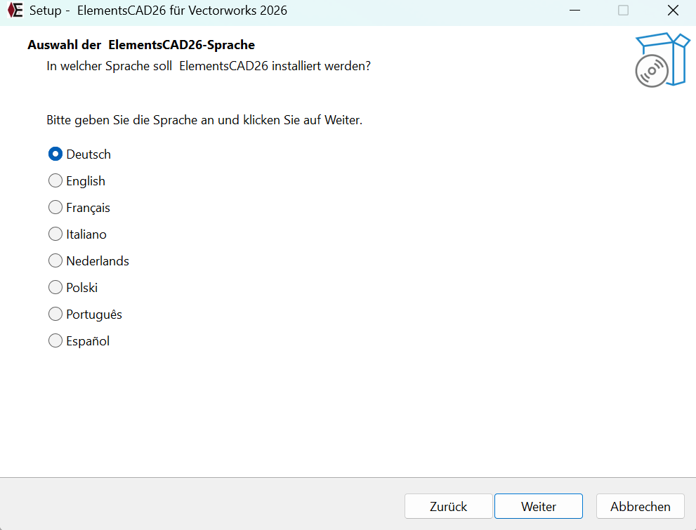 Nach erfolgreicher Auswahl wird die Installation von ElementsCAD normal fortgesetzt.