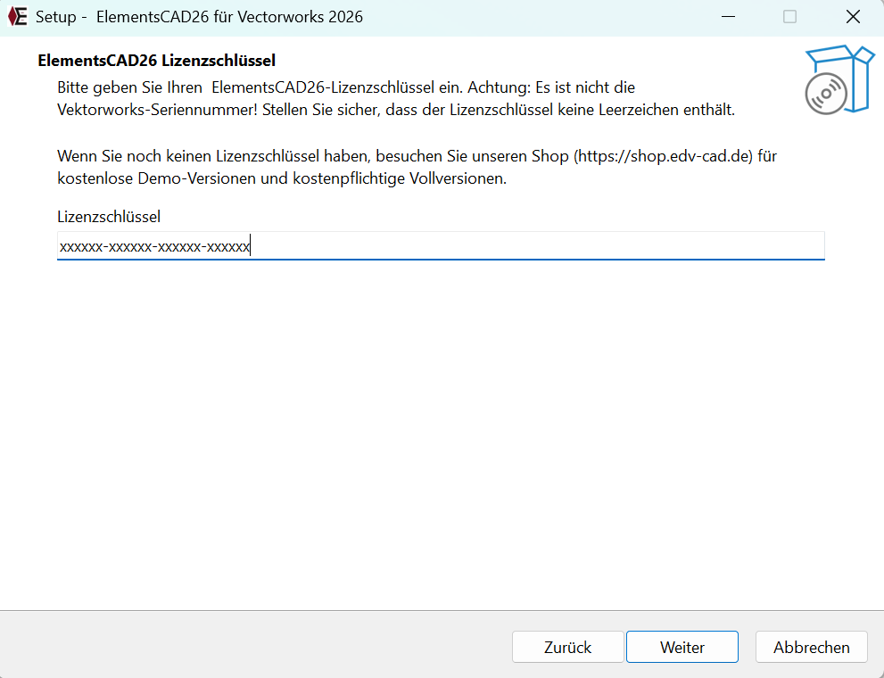 Hinweis: Dieser Schlüssel entspricht nicht die Vectorworks-Seriennummer.