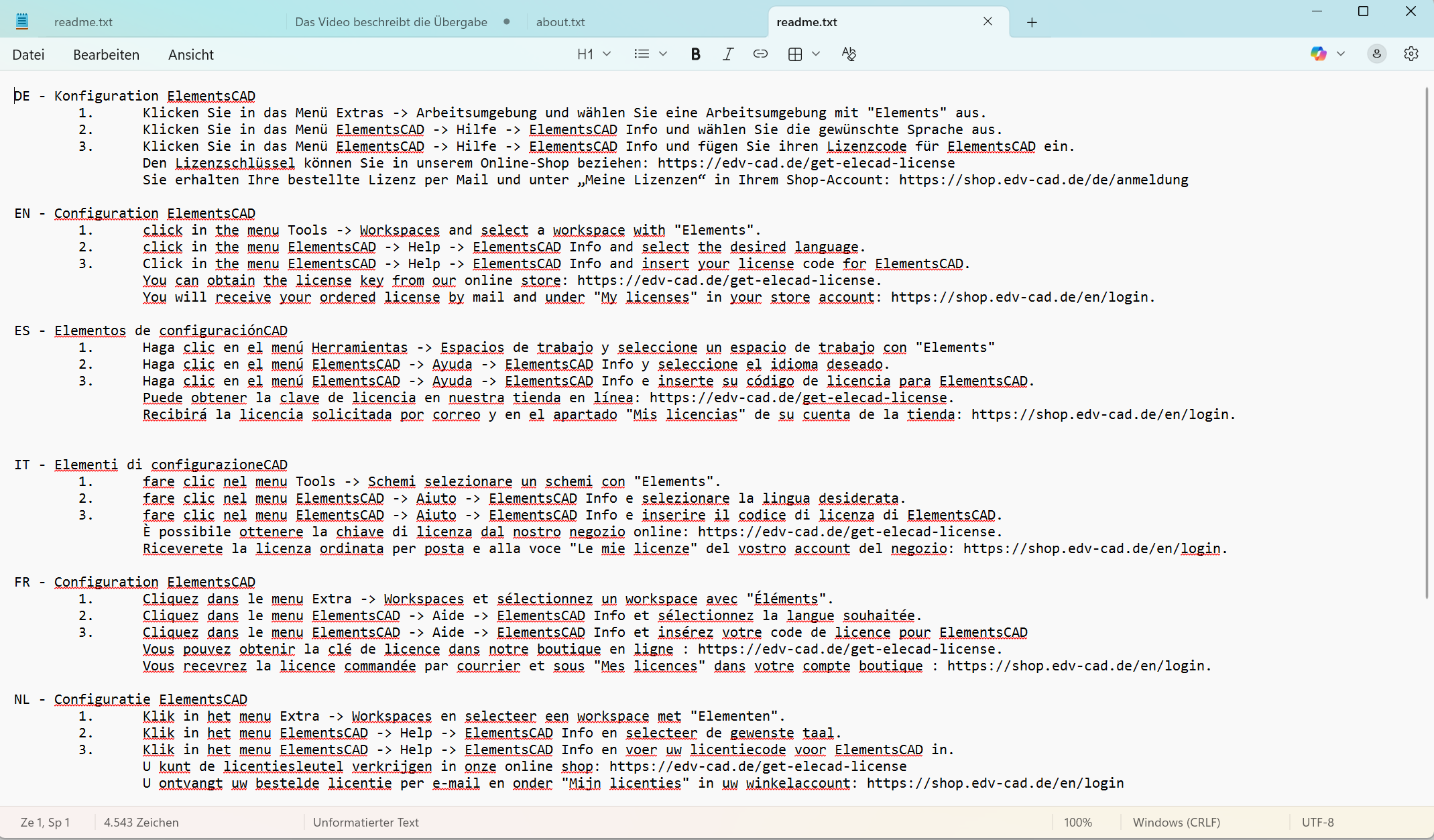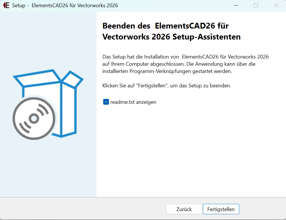 Optional kann die Datei readme.txt geöffnet werden. Diese Datei weist auf diverse Konfigurationen hin, welche nach der Installation von ElementsCAD in Vectorworks noch vorgenommen werden müssen.